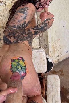 Tattooed diva Lydia Black spat my cum out and rubbed it on her feet. I love to fuck her feet and ass. I love the way she is hungry for my monster cock. I filled her ass with more cum and she squirted all out.